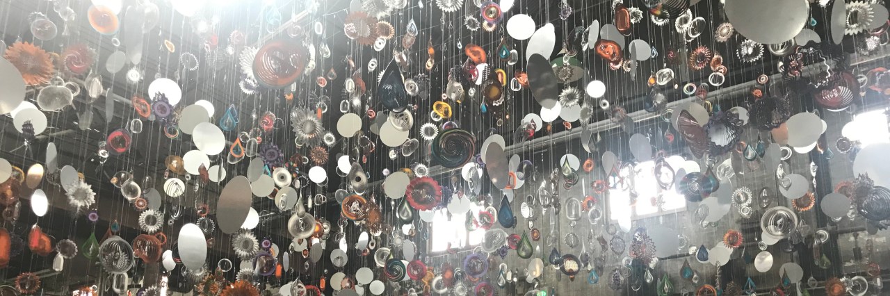 They shimmer, dispersing the light, casting shadows and patterns on the floor. It’s mesmerising. Its vastness envelopes. But it’s calming too, like sitting in a garden with a breeze blowing, mobiles swaying, chimes chinking.
